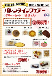 2/14のバレンタインデー用のデザート商品です! リピーター多数の5ヶ入り商品の他に 友チョコやおやつの時間に最適な まるでメル〇○○の様なキュウビックチョコ、 濃厚な味わいのガトーショコラを販売します。 オススメはガト […]