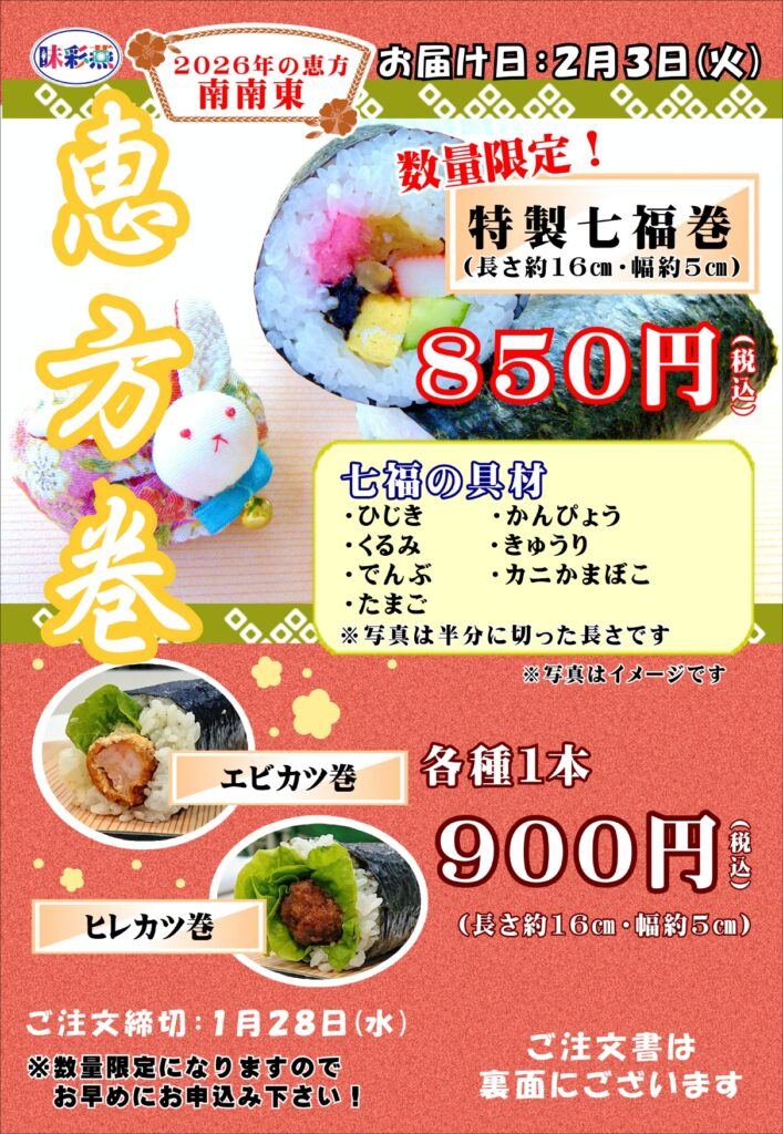 今年は例年通りの七福巻の他にエビカツ巻・ヒレカツ巻を販売します。